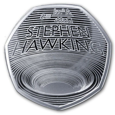 Auf dem Motiv der Silbermünze formieren sich Linien zu einer Art Trichter. Die Idee der Künstlerin war darzustellen, wie sich der Raum um den Ereignishorizont eines Schwarzen Loches krümmt. Ergänzt wird dieses Bild durch den Namen Stephen Hawking und die Bekenstein-Hawking-Formel zur Berechnung der Entropie Schwarzer Löcher. Während dieses Detail vermutlich nur Astrophysiker vollständig würdigen können, erschließt sich der Eindruck von Hawkings faszinierendem Forschungsfeld allen Betrachtern. 27,30 Millimeter Durchmesser hat das Sammlerstück aus Sterling-Silber (Feingehalt: 925/1000). Es wiegt 8 Gramm und trägt den Nennwert von 50 Pence, der umseitig über dem Porträt von Königin Elizabeth II. zu finden ist. Ausgeliefert wird die Silbermünze im Etui, mit Umverpackung und nummeriertem Echtheitszertifikat.