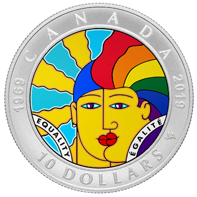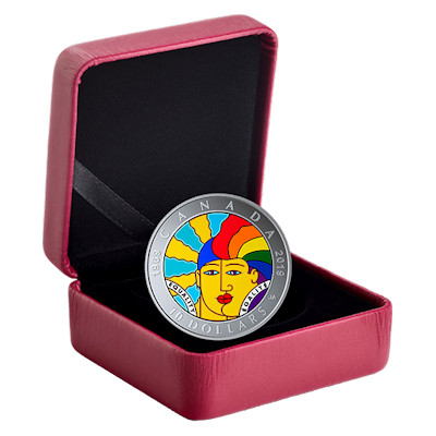 equality-half-oz-silber-koloriertFrau oder Mann, Einwanderer oder Ureinwohner: Das ist dem Paar auf dem Motiv dieser Silbermünze nicht anzusehen. Die beiden regenbogenfarbigen Gestalten erinnern an den Beginn der Entkriminalisierung von Homosexualität in Kanada vor 50 Jahren. Diesem wichtigen Thema hat die Royal Canadian Mint eine eigene Silbermünze unter dem Motto Equality gewidmet. Das Sammlerstück ist mit leuchtenden Farbapplikationen gestaltet und hat eine limitierte Auflage von 15.000 Exemplaren.