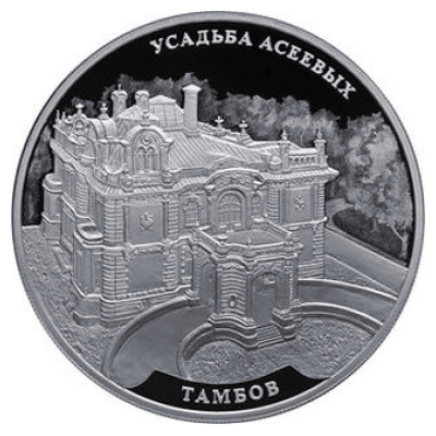 Das prachtvolle Heim der Aseevs wird mitunter als Palast bezeichnet, was angesichts seiner Größe und seiner verspielten Architektur nicht verwundert. Es handelt sich aber um ein bürgerliches Anwesen, das ein erfolgreicher Unternehmer aus Tambow Ende des 19. Jahrhunderts errichten ließ. Tambow ist eine Stadt im Westen Russlands. Der Ortsname ist auf dem Motiv der Silbermünze unten verzeichnet. Nach der russischen Revolution erlebte der Bau eine wechselvolle Geschichte, bis er schließlich vor Kurzem renoviert und in ein Museum umgewandelt wurde. Heute kann man das Haus und den Park mit seinen teils uralten Bäumen besichtigen.
