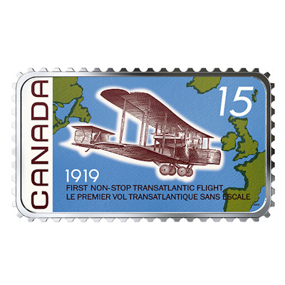 briefmarke-nonstop-transatlantik-flug-1-oz-silber-koloriertVor genau 100 Jahren, am 14. Juni 1919, starteten die britischen Piloten John Alcock und Arthur Whitten Brown in Neufundland zu einem historischen Flug: In ihrem Doppeldecker schafften sie es trotz aller Widrigkeiten bis nach Irland – und damit einmal über den Atlantik. 50 Jahre später erinnerte eine kanadische Briefmarke an ihre Leistung. Und nun, weitere 50 Jahre nach den Ereignissen, hat die Royal Canadian Mint das Design dieser Briefmarke auf eine exklusive Silbermünze in Briefmarkenform übertragen.