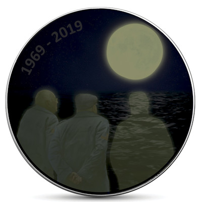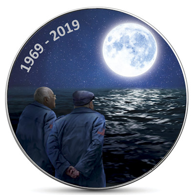 Vor 50 Jahren, am 16. Juli 1969, brachen drei Männer in Florida zu einer Reise auf, die Geschichte schreiben sollte: die Astronauten Neil Armstrong, Edwin „Buzz“ Aldrin und Micheal Collins. Armstrong betrat als Kommandant der Mission Apollo 11 wenige Tage später als erster Menschen den Mond, gefolgt von Aldrin. Collins steuerte inzwischen des Kommandomodul. Das Motiv der Silbermünze zeigt Aldrin und Collins, wei sie ein halbes Jahrhundert später an der Küste stehen und zum Vollmond hinaufblicken, dessen Licht auf dem dunklen Wasser schimmert. Armstrong starb bereits 2012. Doch das Sammlerstück zeigt, dass er keineswegs vergessen ist: Im Dunkeln stehen plötzlich drei schattenhafte Gestalten am Ufer. Die Jahreszahlen 1969 und 2019 am oberen Rand sind der Hinweis auf das Jubiläum.