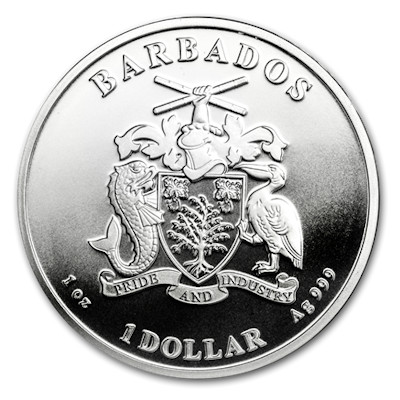 barbados-seepferdchen-1-oz-silber-wertseiteUmseitig findet man zwar kein Seepferdchen, aber zwei weitere Vertreter der Fauna auf Barbados: Eine Goldmakrele und ein Pelikan halten den Wappenschild im Wappen des Landes. Dieser Schild zeigt einen Bartfeigenbaum unter zwei Cesalpinienblüten. Auf dem Schild liegt ein Helm, hinter dem ein Arm mit zwei gekreuzten Zuckerrohrstangen in der Hand hervorragt. Unten ergänzt der Wahlspruch „Pride and Industry“ das Ensemble. Unter dem Wappen findet man den Nennwert von 1 Barbados-Dollar. Die Silbermünze hat einen geriffelten Rand. Sie enthält 1 oz Feinsilber bei einem Feingehalt von 999/1000. Die Münzen sind einzeln gekapselt und in Tubes zu je 20 Stück erhältlich.