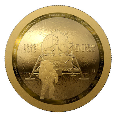 Natürlich stellt das Sammlerstück den kanadischen Beitrag zur Mondlandung in den Vordergrund – die Mondlandefähre. Links davon findet man die Jahreszahlen 1969 und 2019, rechts den Hinweis, dass dieses Ereignis „50 years“ her ist. Vorne ist außerdem ein Astronaut abgebildet. Die zerklüftete Oberfläche des Erdtrabanten im Hintergrund wirkt dank der Wölbung besonders plastisch. Die Goldmünze enthält 1/2 oz Feingold und hat einen Feingehalt von 99,99 Prozent. Der Durchmesser liegt bei 25 Millimetern. Der Münzrand ist geriffelt. Die Wertseite zeigt das Susanna-Blunt-Porträt von Königin Elizabeth II. über dem Nennwert von 100 CAD. Die Goldmünze wird im Etui und mit einem nummerierten Echtheitszertifikat ausgegeben. Die Auflage ist auf nur 700 Stück limitiert.