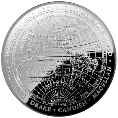 Als Zeitgenosse von William Shakespeare, Queen Elizabeth I., Francis Drake und Thomas Cavendish erlebte John Speed in London eine Blütezeit der Kultur und die Anfänge der Seemacht Großbritannien. Der Sohn eines Schneiders stieg mit Hilfe adliger Förderer zum Gelehrten auf. Vor allem seine Karten überdauerten die Zeit und sind heute wegen ihrer Kunstfertigkeit auch als Drucke beliebt. Bereits in fortgeschrittenem Alter veröffentlichte er den ersten englischen Weltatlas. Die Silbermünze zeigt die detaillierte Karte der westlichen Hemisphäre. Zu sehen sind Nord- und Südamerika; links ist verzeichnet, dass der Kontinent 1492 von Kolumbus entdeckt wurde. Außerdem sind die beiden britischen Weltumsegler Drake und Cavendish mit den Jahreszahlen 1578 und 1586 genannt.