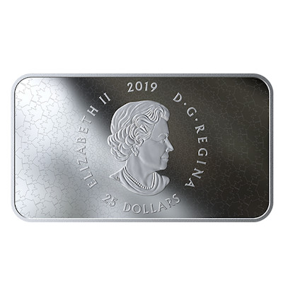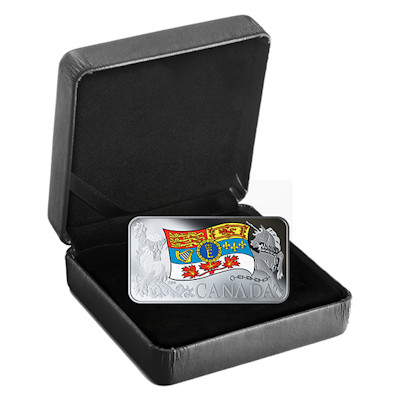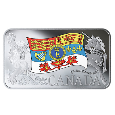 Auf dem Feinsilberbarren, der die Maße 49,8 mal 28,6 Millimeter hat, wird die Flagge mit Farbapplikationen in Szene gesetzt. Zwei ebenfalls aus der Heraldik bekannte Träger vervollständigen das Motiv: ein Löwe und ein Einhorn. Vorbilder dafür waren Elemente aus der Fassade von Rideau Hall, der offiziellen Residenz der Königin in Kanada. Dank der Prägung in höchster Proof-Qualität erscheinen sie äußerst lebendig und bilden einen reizvollen Kontrast zu der farbigen Flagge. Das Sammlerstück enthält 1 1/2 oz Feinsilber und hat einen Feingehalt von 99,99 Prozent. Umseitig zeigt es das Porträt der Queen vor einem Hintergrund aus Ahornblättern. Der Nennwert ist mit 25 CAD angegeben. Der Rand ist geriffelt. Ausgegeben wird der Silberbarren natürlich stilvoll verpackt in ein Etui und inklusive eines nummerierten Echtheitszertifikats.