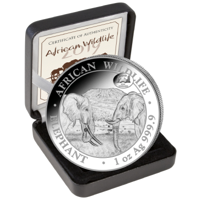 Das Bild ist von einem Rahmen umgeben, auf dem neben dem Namen „African Wildlife Elephant“ die Angaben 1 oz und Ag 999,9 verzeichnet sind. Die Wertseite zeigt das Wappen der Republik Somalia, die bei dieser Serie als Ausgabeland fungiert. Geprägt werden die Silbermünzen jedoch als Agenturausgaben. Der Nennwert beträgt 100 Shillings. Diese Seite trägt auch die Jahreszahl 2019. Der Münzrand ist geriffelt. Da es sich um eine Sonderausgabe mit streng limitierter Auflage handelt, werden die Silbermünzen zusammen mit einem nummerierten Echtheitszertifikat ausgegeben. Außerdem sind sie in ein Etui verpackt.