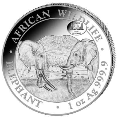 Einen Ausblick auf die African-Wildlife-Elephant-Ausgabe 2020 bekommen Münzsammler mit einer exklusiven Silbermünze, die zur Münzausstellung der American Numismatic Association (ANA) in Chicago ausgegeben wird. Das Sammlerstück mit Privy Mark kombiniert die Wertseite von 2019 mit dem Motiv des Folgejahres. Nur 1000 Exemplare werden von dieser besonderen Münze ausgegeben.