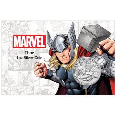 Die Silbermünze zeigt den Comic-Thor in kriegerischer Pose. Den Hammer reckt er dem Betrachter entgegen, die freie Hand ist zur Faust geballt. Außerdem trägt er einen Helm, unter dem seine langen Haare zu sehen sind. Oben sind das Marvel-Logo und der Name Thor in das Motiv integriert. Das Sammlerstück hat einen Durchmesser von 40,60 Millimetern und einen Feingehalt von 99,99 Prozent. Als Ausgabeland fungiert Tuvalu. Der Nennwert liegt bei einem Dollar. Der Münzrand ist geriffelt. Verpackt ist die Silbermünze in eine Coin Card, die ein koloriertes Bild von Thor vor einigen Szenen aus den Comics zeigt. In dieser Verpackung werden nur 1.000 Thor-Münzen ausgegeben.