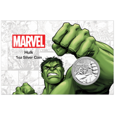 Eigentlich steckt in Hulk der harmlose Wissenschaftler Dr. Bruce Banner. Nachdem dieser jedoch eine Überdosis Gammastrahlen abbekommen hat – in bester Superheldenmanier bei dem Versuch, jemanden zu retten -, verwandelt er sich jedesmal, wenn ihn die Wut packt, in den grünen Muskelprotz Hulk. Dieser wirkt wie eine Mischung aus Frankensteins Monster und Arnold Schwarzenegger zu besten Bodybuilder-Zeiten. Passend zu seiner Persönlichkeit zeigt die Silbermünze Hulk mit wutverzerrtem Gesich und erhobener Faust. Der Hintergrund ist von Bruchlinien durchzogen, als hätte er einfach den Rahmen gesprengt. Sein Name und das Marvel-Logo vervollständigen das Motiv.
