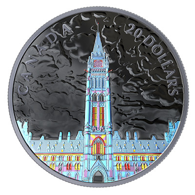 Die Münze aus 1 oz Feinsilber (Feingehalt: 99,99 Prozent) stellt den Peace Tower in den Mittelpunkt, der die stolze Fassade des Parlaments weit überragt. Aus dieser Perspektive sieht das Publikum der Lichtshow die „Leinwand“. Das in Proof-Qualität geprägte Sammlerstück zeigt viele Details des Baus und arbeitet auch den wolkenverhangenen Nachthimmel schön heraus. Seinen ganzen Charme zeigt es aber erst unter Schwarzlicht: Dann leuchten gelbe, rote und rosa Farbtöne auf der Fassade auf. Die Silbermünze hat einen Durchmesser von 38 Millimetern und trägt den Nennwert von 20 CAD. Der Münzrand ist geriffelt. Umseitig findet man das Susanna-Blunt-Porträt von Königin Elizabeth II. Die Münze wird gekapselt, im Etui und mit nummeriertem Echtheitszertifikat ausgegeben.
