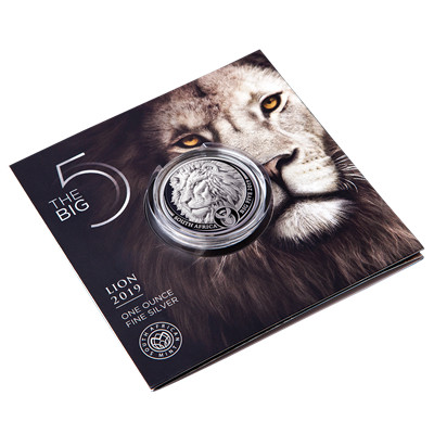 big-five-loewe-1-oz-silber-verpacktSeite an Seite stehen die beiden Löwen auf der Wertseite. Das Bild lässt in der Mitte Platz für die Nennwertangabe (5 Rand). Außerdem sind das Gewicht von 1 oz und der Feingehalt von 999/1000 hier angegeben. Die Silbermünze hat einen Durchmesser von 38,725 Millimetern und einen geriffelten Rand. Sie wird in Blisterverpackung in einer Karte ausgegeben, die ebenfalls einen Löwen zeigt. Der Löwe ist auch als Set in Proof-Prägung erhältlich.