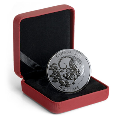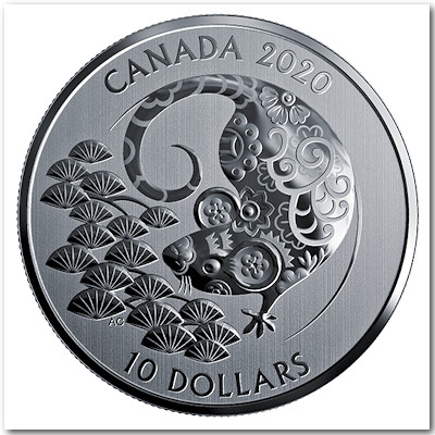 Die Ratte eignet sich hervorragend für die Darstellung auf einer Silbermünze. Körper und Schwanz passen sich an die Rundung an. Das Tierchen sitzt in einer Kiefer, deren stilisierte Nadeln links zu sehen sind. Auf dem Körper der Ratte findet sich das entsprechende chinesische Schriftzeichen. Außerdem ist er mit Glück verheißenden Pfingstrosen- und Pflaumenblüten geschmückt. Unten ist der Nennwert von 10 CAD verzeichnet. Das Sammlerstück ist in Specimen-Qualität aus 1/2 oz Feinsilber (Feingehalt 99,99 Prozent) geprägt und hat einen Durchmesser von 34 Millimetern. Der Münzrand ist geriffelt. Umseitig zeigt es das Susanna-Blunt-Porträt von Königin Elizabeth II. Ausgegeben wird die Silbermünze im Etui und inklusive eines nummerierten Echtheitszertifikats. Die Auflage ist eine Hommage an die chinesische Glückszahl Acht: Sie ist auf 18.888 Stück begrenzt.