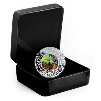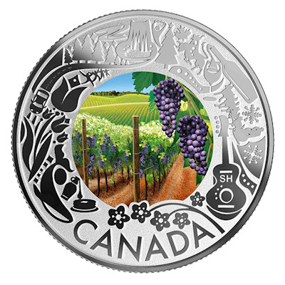 Im Zentrum der Weinproben-Silbermünze steht das Bild idyllischer Weinberge, die sich bis zu einem Wald am Horizont ausbreiten. Im Vordergrund sind vollreife Rotweintrauben abgebildet, bei deren Anblick dem Betrachter das Wasser im Mund zusammen läuft. Der breite silberne Rahmen um diese kolorierte Mitte zeigt Symbole für verschiedene Feste und jahreszeitliche Vergnügen, die typisch für Kanada sind. Weinflasche und Glas findet man rechts oben, direkt unter einem Rodeo-Reiter. Im Uhrzeigersinn sind von hier aus unter anderem ein Hundeschlitten, eine Gitarre als Symbol für Folk-Musik, ein Kirschblütenzweig, ein Krug mit Ahornsirup, ein Wal, eine Tulpe, ein Auto auf der Straße, die Aurora borealis, die Niagarafälle und ein Tannenbaum zu erkennen.