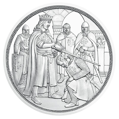 mit-kettenhemd-und-schwert-abenteuer-silber-blister-2Auf dem Motiv der Silbermünze ist ein junger Mann zu sehen, der gerade von seinem Dienstherren zum Ritter geschlagen wird. Drei weitere Ritter sind Zeugen der Zeremonie. Alle tragen das Jerusalemkreuz als Symbol dafür, dass sie am Heiligen Grab in den Ritterstand erhoben wurden. Gottfried von Bouillon war der erste, der es nach der Eroberung Jerusalems im Jahr 1099 als Wappen benutzte. Etwa ein Jahr lang herrschte der Kreuzfahrer als Regent und „Beschützer des Heiligen Grabes“ über das neu gegründete Kreuzfahrerreich, bevor er einer Krankheit erlag.