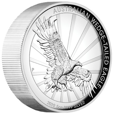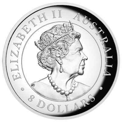 Das Motiv ist von einem Rahmen umgeben, in den die Spitzen der weit ausgebreiteten Adlerflügel hineinragen. Auf dem Rahmen sind die Angaben zum Gewicht von 5 oz Feinsilber und dem Feingehalt von 99,99 Prozent verzeichnet. Der Münzrand ist geriffelt und 11 Millimeter dick. Das in höchster Proof-Qualität und exquisitem Hochrelief geprägte Sammlerstück zeigt umseitig das neue Porträt der Königin Elizabeth II. von Jody Clark. Die Silbermünze gilt als gesetzliches Zahlungsmittel in Australien mit dem Nennwert von 8 Dollars. Sie wird im Etui und einem passenden Shipper mit Adlerbild ausgegeben. Ein nummeriertes Echtheitszertifikat gehört außerdem dazu.
