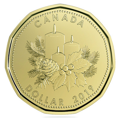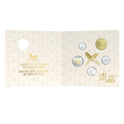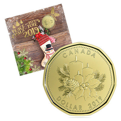 Vergangenes Jahr gab es noch Zuckerstangen, dieses Jahr haben sich die Designer des Weihnachts-Dollars für ein besinnlicheres Motiv entschieden: Es zeigt drei brennende Kerzen umgeben von Stechpalmen- und Kiefernzweigen. Dieses Münzmotiv ist auch zu sehen, wenn man die Karte, in die das Holiday Set verpackt ist, zuklappt. Außen trägt sie die Aufschrift „Peace and Joy“; darunter ist ein gut gefüllter Weihnachtsstrumpf mit Schneemann-Motiv zu sehen. Innen lautet der Text „Wishing you all the best this holiday season!“. Beides wird durch die französische Übersetzung ergänzt.