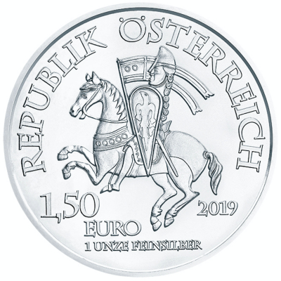 825-jahre-muenze-oesterreich-robin-hood-1-oz-silber-wertseiteDas Motiv der Silbermünze zeigt Robin Hood, wie man ihn am besten kennt: als Bogenschützen. Blätter rings um die Gestalt stehen für den Wald als Versteck seiner Bande. Die Wertseite zeigt dagegen den Mitauslöser der englischen Misere, Herzog Leopold V. von Österreich. Diese Seite, die nach dem Vorbild eines mittelalterlichen Siegels gestaltet ist, bleibt bei allen drei Ausgaben gleich. Die Silbermünze aus 1 oz Feinsilber hat einen Feingehalt von 999/1000 und einen Durchmesser von 37 Millimetern. Der Münzrand ist glatt. Wie der Wiener Philharmoniker trägt die in Stempelglanz geprägte Münze den Nennwert von 1,5 Euro.