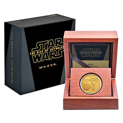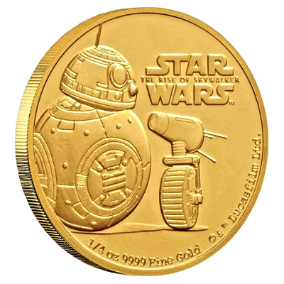star-wars-bb-8-quarter-oz-goldAm 18. Dezember 2019 geht die Star-Wars-Saga zu Ende. Bereits vor dem Kinostart von „Episode IX – Der Aufstieg Skywalkers“ gibt es bei der New Zealand Mint die passenden Sammlerstücke zum Abschlussfilm der Sequel-Trilogie: zwei Silbermünzen und eine Goldmünze. Letztere ist den Star-Wars-Droiden gewidmet und zeigt neben Publikumsliebling BB-8 den Neuzugang D-O. Das Sammlerstück aus 1/4 oz Feingold hat eine streng limitierte Auflage von nur 500 Exemplaren.