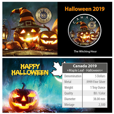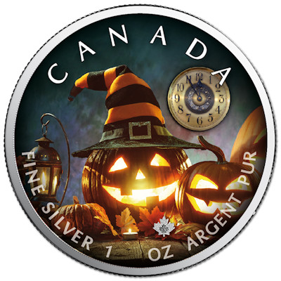 Fünf Minuten vor Mitternacht – die Geisterstunde naht! Dann treiben dem Volksglauben zufolge Hexen ihr Unwesen, die Toten steigen aus ihren Gräbern, Geister gehen um und vielleicht erscheint sogar der Teufel. Ein altmodisches Zifferblatt auf dem Motiv der Silbermünze „The Witching Hour“ stellt die Verbindung zum Titel der Ausgabe her. Daneben sind zwei Kürbislampen abgebildet, wobei die größere einen spitzen Hexenhut mit schwarzen und orangen Streifen trägt. Links ist noch eine kleine Hängelampe im Bild, außerdem vervollständigen weitere Kürbisse und herbstlich bunte Ahornblätter das Motiv. Zwischen ihnen ist auch das silberne Privy Mark in Form eines Ahornblatts zu entdecken.