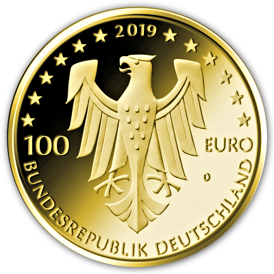 „A“ für Berlin, „D“ für München, „F“ für Stuttgart, „G“ für Karlsruhe und „J“ für Hamburg: Das Zeichen der jeweiligen Prägestätte ist auf der Wertseite gleich neben dem Bundesadler zu finden. Dieser wird auf der Goldmünze von der Nennwertangabe eingerahmt. Die zwölf Europasterne sind am Rand entlang in der oberen Münzhälfte platziert, die Aufschrift „Bundesrepublik Deutschland“ in der unteren. Ganz oben steht die Jahresangabe. Bis auf das kleine Zeichen der Prägestätte ist das Motiv der Goldmünzen gleich. Das gilt natürlich auch für die umseitige Darstellung des Doms zu Speyer.