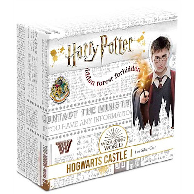 harry-potter-hogwarts-castle-1-oz-silber-verpackungDas Motiv der Silbermünze zeigt den Blick über den Großen See zum Schloss, das am gegenüber liegenden Ufer aufragt. Im Vordergrund gleitet gerade Harrys Eule Hedwig übers Wasser. Dank der Proof-Prägung sind die Details faszinierend klar – bis hin zum Gefieder der Schneeeule. Das Sammlerstück für Fantasy-Fans hat einen Durchmesser von 40 Millimetern und einen geriffelten Rand. Es enthält 1 oz Feinsilber (Feingehalt 999/1000). Ausgabeland ist Niue. Die Wertseite zeigt dessen offizielles Staatsoberhaupt Königin Elizabeth II. Der Nennwert ist mit 2 Dollars angegeben. Die Silbermünze kommt im Etui und inklusive eines nummerierten Echtheitszertifikats zum Sammler. Die Umverpackung zeigt Harry Potter mit erhobenem Zauberstab vor einem Hintergrund, der wie Nachrichten aus dem „Tagespropheten“ gestaltet ist.