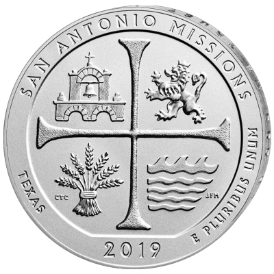Ab dem 17. Jahrhundert gründeten spanische Missionare einige Missonsstationen am San Antonio River im heutigen Texas. Die Ureinwohner der Gegend konnten dort Zuflucht finden – zum Beispiel vor kriegerischen Apachen. Voraussetzung dafür war allerdings, den christlichen Glauben anzunehmen und ihre eigenen Traditionen aufzugeben. Das Design des Münzmotivs ist von spanischen Reales aus der Kolonialzeit inspiriert: Ein Kreuz in der Mitte teilt die Münze in vier Felder. In einem ist eine Weizengarbe als Symbol für den Ackerbau der Missionen zu sehen. Die Bögen und die Glocke darüber stehen für die Gemeinschaft. Der gekrönte Löwe repräsentiert Spanien und das spanische Kulturerbe. Die Wellen im letzten Viertel stehen für den San Antonio River und die Bewässerungssysteme der Missionsstationen.