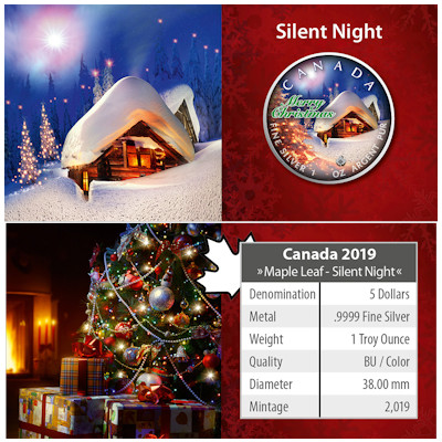 maple-leaf-silent-night-2019-1-oz-silber-koloriertAlle Jahre wieder gibt es drei zauberhafte Weihnachts-Ausgaben der Silbermünze Maple Leaf. 2019 stehen ein nostalgisches Weihnachtsmann-Motiv, ein appetitliches Plätzchen-Motiv und eine romantische Winterszene zur Auswahl. Letztere steht unter dem Motto Silent Night. Wie die anderen beiden Silbermünzen ist sie stimmungsvoll koloriert und hat eine streng limitierte Auflage von nur 2.019 Exemplaren.