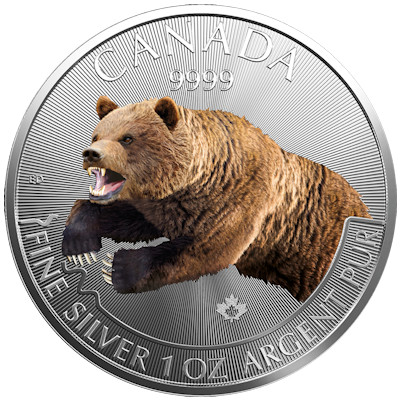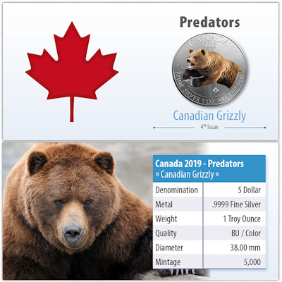 Der Puma war das erste der kanadischen Raubtiere, das für diese Serie von Anlagemünzen ausgewählt wurde. Zuvor hatte die Prägeanstalt schon den kanadischen Greifvögeln wie dem Virginia-Uhu eine eigene Bullion-Serie gewidmet. Der Grizzly bildet den krönenden Abschluss der zweiten Serie. Die großen Braunbären leben heute vor allem in Kanadas Westen und Norden, in British Columbia, Alberta und den Northwest Territories. Als Allesfresser ernähren sie sich nur zum Teil von Fleisch. Wurzeln und Beeren, Gräser, Insekten und Larven stehen ebenso auf dem Speiseplan wie Karibus, Elche oder Weißwedelhirsche. Im Westen versammeln sie sich zur Zeit der Lachswanderung an den Flüssen. Auch wenn sie Menschen meist aus dem Weg gehen, können Grizzlys sehr gefährlich werden, denn trotz ihrer gemütlich anmutenden Statur sind sie sehr schnell.