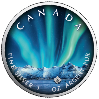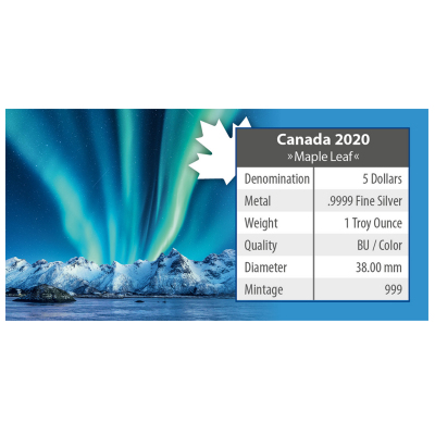 Das Maple Leaf, dem die Silbermünze ihren Namen verdankt, ist hier als Privy Mark vertreten. Das Gewicht von 1 oz Feinsilber und der Feingehalt von 99,99 Prozent sind am Rand verzeichnet. Der Nennwert von 5 CAD ist umseitig unter dem Susanna-Blunt-Porträt von Königin Elizabeth II. zu finden. Der Münzrand ist geriffelt. Das Sammlerstück ist in BU-Qualität geprägt. Es wird gekapselt und in eine Karte verpackt ausgegeben. Auf der Coin Card sind nicht nur die Daten der Münze verzeichnet, sie greift auch das Motiv auf und zeigt die beeindruckenden Polarlichter.