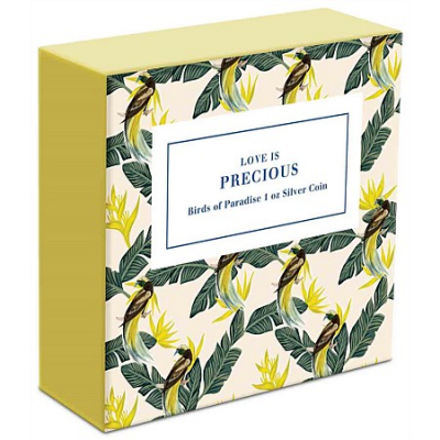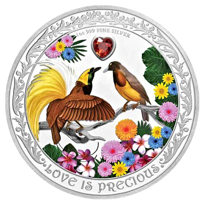 Das farbige Bild ist von einem mit Ornamenten verzierten Rahmen umgeben, in den auch der Titel „Love is precious“ eingebettet ist. Die in höchster Proof-Qualität geprägte Silbermünze enthält 1 oz Feinsilber (Feingehalt 999/1000) und hat einen Durchmesser von 40 Millimetern. Der Münzrand ist geriffelt. Auf der Wertseite findet man das Porträt von Königin Elizabeth II. und das Ausgabeland Niue. Der Nennwert beträgt zwei Dollars. Das romantische Sammlerstück ist passend zum Thema in ein herzförmiges Etui verpackt. Der Shipper zeigt das Paradiesvogel-Männchen mit seinem Prachtgefieder. Die Auflage ist auf nur 3.000 Stück limitiert.