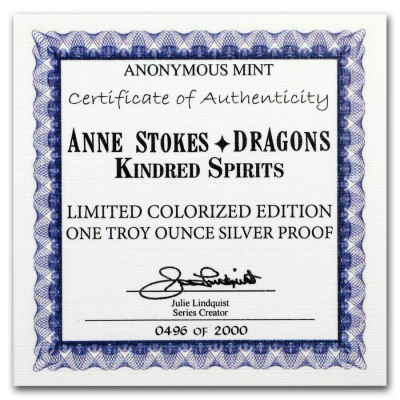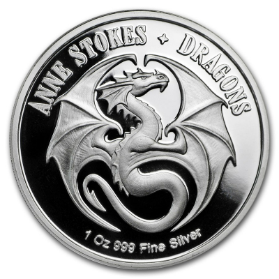 Ein weiterer, ebenfalls von Anne Stokes entworfener Drache ist umseitig zu finden. Diese emblemhafte Darstellung zeigt einen Drachen mit ausgebreiteten Flügeln, wobei diese einen Kreis bilden, der Kopf und Schwanz des Fabelwesens umschließt. Darunter sind das Gewicht von 1 oz Feinsilber sowie der Feingehalt von 999/1000 verzeichnet, darüber der Name der Serie, „Anne Stokes Dragons“. Das Sammlerstück hat einen Durchmesser von 39 Millimetern. Der Rand ist glatt mit eingravierter Seriennummer. Die Sammlerstücke werden gekapselt und mit einem nummerierten Echtheitszertifikat ausgegeben.