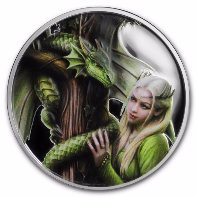 Drache ist nicht gleich Drache – das gilt auch für die neue Silber-Serie mit Motiven der Fantasy-Künstlerin Anne Stokes. Nach dem riesigen und gefährlich wirkenden Exemplar auf der Ausgabe Friend or Foe zeigt das Sammlerstück „Kindred Spirits“ ein kleines und fast niedliches Fabeltier. Die Farbapplikationen sind diesmal in Grüntönen gehalten. 2.000 Exemplare dieses Drachens sind zu haben.