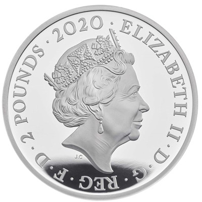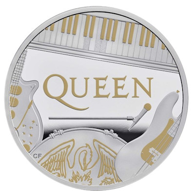 music-legends-queen-1-oz-silber-koloriert-wertseiteAuf dem Motiv der Silbermünze steht das golden kolorierte Queen-Logo im Mittelpunkt. Rund herum sind die Instrumente der Bandmitglieder angeordnet. Auf dem Piano markieren Farbapplikationen den Anfangsakkord von Bohemian Rhapsody, dem Titel, mit dem Queen der Durchbruch gelang. Unten in der Mitte ist Roger Taylors Schlagzeug mit dem ebenfalls kolorierten Queen-Emblem zu sehen. Es wird eingerahmt von Brian Mays selbstgebauter Gitarre und John Deacons. Ein Mikrofon unter dem Logo vervollständigt das Motiv. Das Sammlerstück ist in höchster Proof-Qualität geprägt und hat einen Durchmesser von 38,61 Millimetern. Es enthält 1 oz Feinsilber (Feingehalt: 999/1000). Der Münzrand ist geriffelt. Auf der Wertseite findet man das Porträt von Königin Elizabeth II., daneben den Nennwert von 2 Pfund. Die Münze wird im Etui und zusammen mit einem nummerierten Echtheitszertifikat ausgegeben.