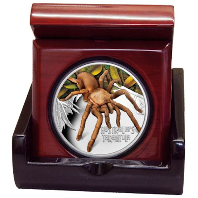 deadly-and-dangerous-tarantula-1-oz.silber-koloriert-etuiUnter den australischen Spinnen gehören die Vogelspinnen eher zu den harmlosen Exemplaren. Anders als die Rotrückenspinne oder die aggressive und hochgiftige Trichternetzspinne nisten sie sich nicht gern in Häusern ein. Schon wegen ihrer schieren Größe von bis zu 16 Zentimetern mit Beinen würden sie dort auch schnell auffallen. Besonders an den Vogelspinnen ist auch, dass sie – wahrscheinlich wenn sie sich bedroht fühlen – ein pfeifendes oder bellendes Geräusch produzieren können. Anders als ihr Name vermuten lässt, ernähren sich die Vogelspinnen hauptsächlich von Insekten, Echsen und Fröschen. Ihr Biss ist für Menschen nicht gefährlich, wegen der langen Fänge aber schmerzhaft. Außerdem ist die Infektionsgefahr ist relativ groß, deshalb sollten Betroffene einen Arzt aufsuchen.