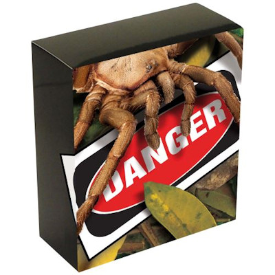 deadly-and-dangerous-tarantula-1-oz.silber-koloriert-shipperDie kolorierte Spinne füllt das ganze Münzmotiv aus und gibt dadurch einen Eindruck von der Größe dieser Art. Im Hintergrund sind Blätter und Zweige zu sehen. Direkt unter dem Kopf der Spinne ist die Aufschrift „Australia’s Tarantula“ zu lesen. Die Silbermünze ist in höchster Proof-Qualität aus 1 oz Feinsilber geprägt. Sie hat einen Feingehalt von 99,99 Prozent. Der Durchmesser beträgt 40,6 Millimeter. Der Münzrand ist geriffelt. Das Sammlerstück gilt als gesetzliches Zahlungsmittel in Tuvalu mit dem Nennwert von 1 Dollar. Die Wertseite zeigt das Ian-Rank-Broadley-Porträt von Königin Elizabeth II. Die Silbermünze wird im Etui, mit Umverpackung im Seriendesign und mit einem nummerierten Echtheitszertifikat ausgegeben.
