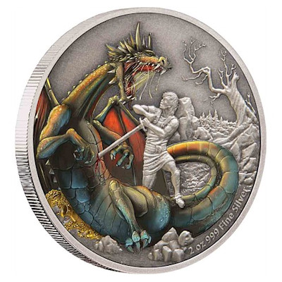 Legendäre Drachen hat sich die New Zealand Mint für eine besonders eindrucksvolle Silbermünzen-Serie ausgesucht. Die erste Ausgabe zeigt den Drachenkampf in Wales , die zweite ist von der Geschichte der vier Drachen aus China inspiriert. Bei der dritten wird es nun ziemlich blutrünstig: Die Silbermünze The North Dragon zeigt Fafnir, der von Sigurd getötet wird. Farbapplikationen lassen das Motiv besonders lebensecht erscheinen. Die Auflage beträgt 2.000 Exemplare.
