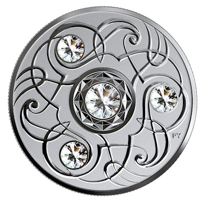 Nicht nur der große Stein in der Mitte funkelt verführerisch. Ringsum verleihen drei kleinere Swarovski-Kristalle der Silbermünze zusätzlichen Glanz. Ein von keltischer Kunst inspiriertes Muster vervollständigt das Motiv. Das Sammlerstück hat einen Durchmesser von 27 Millimetern und enthält 1/4 oz Feinsilber (Feingehalt 99,99 Prozent). Die Wertseite zeigt das Susanna-Blunt-Porträt von Königin Elizabeth II. Der Nennwert ist mit 5 CAD angegeben. Die Münze hat einen geriffelten Rand und wird gekapselt sowie verpackt in ein Etui ausgegeben. Ein nummeriertes Echtheitszertifikat gehört dazu.