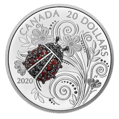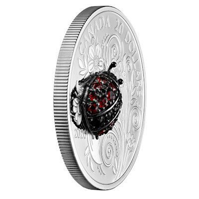 Die Royal Canadian Mint hat sich für die umgekehrte Variante entschieden. Der mit Rhodium überzogene Käfer ist mit schwarzen Sapphiren geschmückt und trägt leuchtend rote Punkte aus Granat. Er sitzt auf der Münzoberfläche, als wäre er dort gerade gelandet. Die spiegelnde silberne Oberfläche bringt das Funkeln der Edelsteine gut zur Geltung. Das Blumenmuster im Hintergrund rundet das Motiv ab. Oben ist der Nennwert von 20 CAD verzeichnet. Der Münzrand ist geriffelt. Umseitig ist das Susanna-Blunt-Porträt der Queen zu sehen. Die Silbermünze aus 1 oz Feinsilber (Feingehalt 99,99 Prozent) hat einen Durchmesser von 38 Millimetern. Sie wird im Etui und inklusive eines nummerierten Echtheitszertifikats ausgegeben. Mit dem Marienkäfer setzt die Royal Canadian Mint ihre Serie „Bejeweled Bugs“ fort, in der bereits die Ausgaben Schmetterling und Biene erschienen sind.