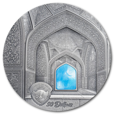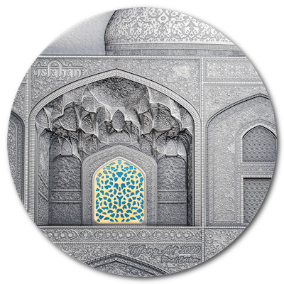 Ende des 16. Jahrhunderts ließ Abbas I., Schah von Persien, in Isfahan, das er zur Hauptstadt seines Reiches machte, den Naqsch-e-Dschahan-Platz anlegen. Wichtige Gebäude wie der Königspalast liegen direkt an dem 560 mal 160 Meter großen Platz. Ein Blickfang ist die blaue Fassade der Scheich-Lotfollah-Moschee im Osten. Dieser Bau aus dem frühen 17. Jahrhundert ist sowohl innen als auch außen mit Kacheln geschmückt. Die kunstvolle Gestaltung machte ihn zur nahe liegenden Wahl für das Tiffany-Element der Silbermünze: Blaue Glasteile fügen sich zur Pforte zusammen, während die detailverliebte Prägung des Sammlerstücks die architektonische Pracht dieses Baus der Safawiden-Zeit einfängt.