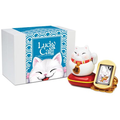 glueckskatze-2020-1-oz-silber-koloriert-verpackungDie Winkekatze oder Maneki-neko ist ein Glückssymbol aus Japan, das auch in China weit verbreitet ist – sowie in asiatischen Restaurants und Geschäften auf der ganzen Welt. Während sie dort Gäste oder Kunden „herbeiwinken“ soll, stellt man sie zu Hause auf, um Glück und Wohlstand ins Haus zu holen. Als Zeichen dafür hält die mit Farbapplikationen gestaltete Katze auf der Silbermünze nicht nur einen ebenfalls kolorierten Karpfen im Arm, sondern ist auch noch von traditionellen Münzen umgeben. Die Schriftzeichen über dem Kätzchen haben die Bedeutung „reichlich Jahr für Jahr“. Dem Besitzer dieser Glückskatze soll es also in Zukunft an nichts fehlen.