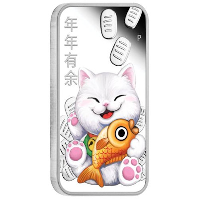 glueckskatze-2020-1-oz-silber-koloriertFür eine Katze bedeutet es sicher Glück, einen fetten Fisch gefangen zu haben. Allerdings ist der Karpfen auf der Silbermünze Lucky Cat 2020 der Perth Mint natürlich keine Jagdbeute, sondern ein weiteres Glückssymbol: Er steht für Überfluss, nicht nur für ein Mittagessen. Wenn es auch mal ein bisschen kitschiger sein darf, ist der Silberbarren aus 1 oz Feinsilber jedenfalls der ideale Glücksbringer, denn er wird im Set mit einer Winkekatze ausgeliefert. Die Auflage ist auf nur 3.000 Stück limitiert.