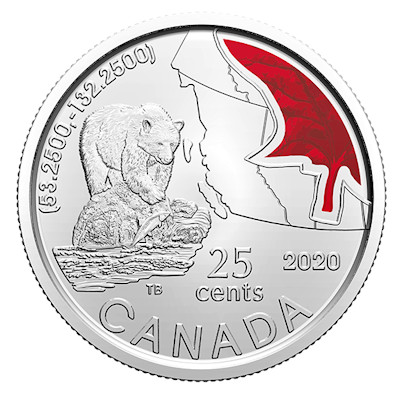 Jede Münze zeigt ein Stück der Karte des Landes und einen Teil des rot kolorierten Ahornblatts, das die Münzen verbindet. Außerdem sind ein besonderer Vertreter der Tierwelt der jeweiligen Küste und GPS-Koordinaten verzeichnet. Bei der Pazifikküste verweisen diese auf Haida Gwaii, eine Inselgruppe vor British Columbia. Daneben ist ein Kermodebär beim Lachsfischen zu sehen. Diese Bären sind eng mit den Schwarzbären verwandt, durch eine Genmutation hat aber ein Teil der Tiere ein helles Fell. Auf der Coincard ist die Fotovorlage für das Motiv abgedruckt. Wer dieses Bild sieht, versteht, warum die Tiere auch als „Geisterbären“ bekannt sind.