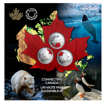 Jede Münze trägt den Nennwert von 25 Cent. Sie bestehen wie die gewöhnlichen kanadischen Kursmünzen aus vernickeltem Stahl und haben einen geriffelten Rand. Der Durchmesser liegt bei 27,13 Millimetern. Umseitig ist das Porträt von Königin Elizabeth II. abgebildet. Die aufklappbare Karte zeigt vorne Bilder von allen drei Tierarten und enthält innen viele Infos. So erfährt man zum Beispiel, dass Kanada die längste Küstenlinie der Welt hat. Wie in dem zweisprachigen Land üblich, sind alle Texte auf Englisch und Französisch abgedruckt.