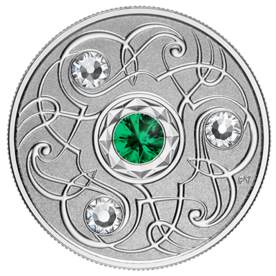 Auf diesem silbernen Sammlerstück vertritt ein smaragdgrüner Swarovski-Kristall den Edelstein – daher der erschwingliche Preis. Drei kleinere Swarovski-Kristalle sind ringsum angeordnet und fügen sich in die Kringel des von keltischer Kunst inspirierten Musters ein. Die Silbermünze hat einen Durchmesser von 27 Millimetern und enthält 1/4 oz Feinsilber (Feingehalt 99,99 Prozent). Umseitig findet man das Susanna-Blunt-Porträt von Königin Elizabeth II. und den Nennwert von 5 CAD. Das Sammlerstück hat einen geriffelten Rand und wird gekapselt sowie verpackt in ein Etui ausgegeben. Ein nummeriertes Echtheitszertifikat gehört dazu. Die Auflage ist auf 5.000 Stück limitiert.