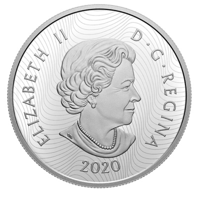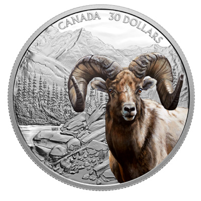 Die Silbermünze zeigt einen beeindruckenden Bock direkt von vorn und ganz aus der Nähe. Farbapplikationen lassen den erfahrenen König der Berge noch lebendiger erscheinen. Seine Augen glänzen bernsteinfarben und auf seiner Stirn sieht man die Narben vergangener Kämpfe. Der große Durchmesser von 50 Millimetern lässt auch noch genug Platz für die detailreiche Gestaltung der Umgebung. Ein felsiges Seeufer, schlanke Nadelbäume und hohe Gipfel geben einen Eindruck von der Landschaft der Rockies. Oben ist der Nennwert von 30 CAD verzeichnet. Die Silbermünze enthält 2 oz Feinsilber (Feingehalt: 99,99 Prozent) und hat einen geriffelten Rand. Umseitig ist das Susanna-Blunt-Porträt von Königin Elizabeth II. zu sehen, darunter die Jahreszahl 2020. Das Sammlerstück wird gekapselt und mit nummeriertem Echtheitszertifikat ausgeliefert, außerdem gibt es zur ersten Ausgabe ein Etui, in dem auch die beiden weiteren Editionen Platz haben.