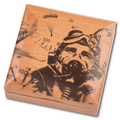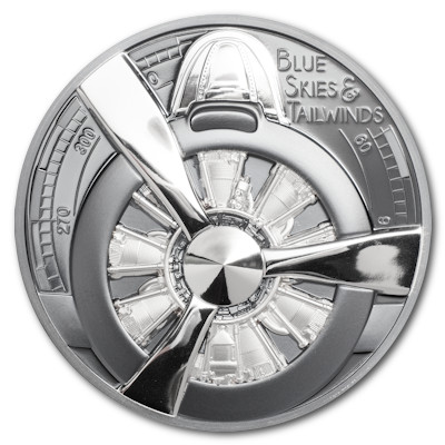 Die glänzenden Rotorblätter des Propellers teilen das Münzmotiv in ungleiche Drittel. Es lohnt sich aber, genauer hinzuschauen: Dahinter ist der detailreich gestaltete Motor zu erkennen. Die Silbermünze hat einen Durchmesser von 62,206 Millimetern und enthält 2 oz Feinsilber (Feingehalt 999/1000). Auf der Wertseite findet man das Porträt von Königin Elizabeth II. Ausgabeland sind die Cook Islands; der Nennwert beträgt 10 Dollars. Die Silbermünze wird in einem passenden Karton mit dem Bild eines Piloten ausgegeben. Ein nummeriertes Echtheitszertifikat gehört dazu.
