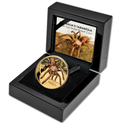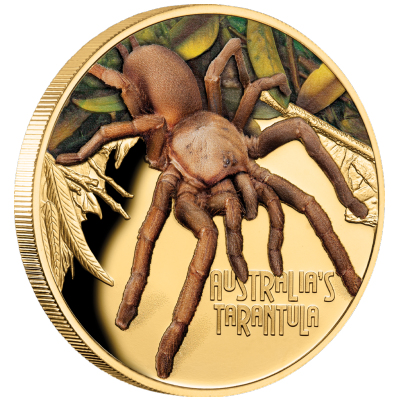 Durch ihre Größe wirkt die Vogelspinne ganz schön Respekt einflößend. Das Münzmotiv vermittelt diesen Eindruck, indem fast die ganze Fläche von der langbeinigen Spinne beansprucht wird. Direkt unter ihren Fängen ist der Name „Australia’s Tarantula“ verzeichnet. Die Goldmünze ist in höchster Proof-Qualität geprägt. Sie enthält 1 oz Feingold bei einem Feingehalt von 99,99 Prozent. Der Durchmesser liegt bei 38,6 Millimetern. Der Münzrand ist geriffelt. Auf der Wertseite findet man das Ian-Rank-Broadley-Porträt von Königin Elizabeth II. Das Sammlerstück gilt als gesetzliches Zahlungsmittel von Niue mit dem Nennwert von 100 Dollars. Es wird in einem stilvollen Etui und einem goldenen Shipper ausgegeben. Ein nummeriertes Echtheitszertifikat gehört auch noch dazu.