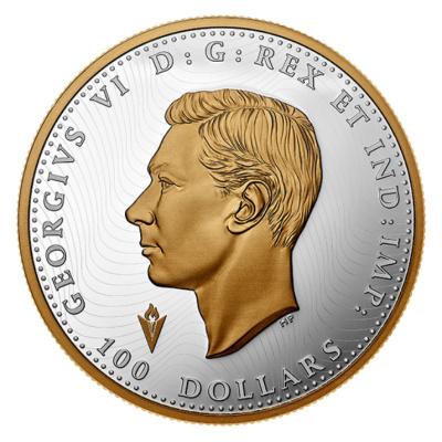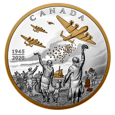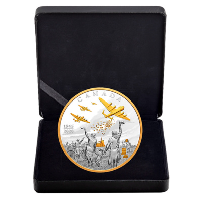 Mit einem Durchmesser von 76,25 Millimetern bietet die Silbermünze viel Platz für ein detailreiches Bild. Die Vergoldung hebt einige dieser Details hervor, darunter einserseits die Bomber und die abgeworfenen Pakete, aber auch eine Windmühle, um die Szene zu verorten. Links sind die Jahreszahlen 1945 und 2020 verzeichnet. Auf dem geriffelten Rand und auf der Wertseite setzt sich die Vergoldung fort. Mit Gold überzogen sind hier das Victory-Privy-Mark, mit dem die Prägeanstalt ihre Sammlerstücke zum Jubiläum des Kriegsendes dekoriert, sowie das Porträt von König George VI. Darunter findet man den Nennwert von 100 CAD. Die Münze enthält 10 oz Feinsilber bei einem Feingehalt von 99,99 Prozent. Sie wird mit einem nummerierten Echtheitszertifikat, gekapselt und im Etui ausgegeben.