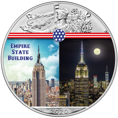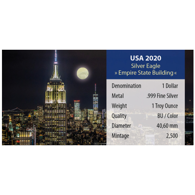 Über dem kolorierten Manhattan-Bild ist ein Teil der „Walking Liberty“ zu sehen, die die Silbermünze American Silver Eagle gewöhnlich ziert. Die „Stars and stripes“ der US-Flagge bilden den Übergang zwischen den beiden Motivteilen. Auf der Wertseite findet man den Weißkopfseeadler, dem die Anlagemünze ihren Namen verdankt. Auch die Sonderedition enthält 1 oz Feinsilber (Feingehalt: 999/1000) und trägt den Nennwert von 1 US-Dollar. Sie hat einen geriffelten Rand und einen Durchmesser von 40,60 Millimetern. Verpackt ist das in Stempelglanz-Qualität geprägte Sammlerstück in eine Coincard, die ein Bild des Empire State Buildings bei Nacht zeigt.