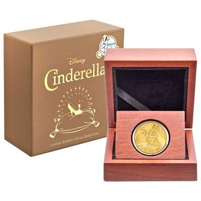 Das Motiv der Goldmünze zeigt die Szene zu „So This Is Love“: Cinderella und der Prinz haben sich von der Ballgesellschaft entfernt und tanzen auf der Terrasse. Im Vordergrund sind ein paar Blätter zu sehen, im Hintergrund wirft das Paar einen großen Schatten auf die Schlossmauern. Das Sammlerstück enthält 1/4 oz Feingold und hat einen Feingehalt von 99,99 Prozent. Der Durchmesser liegt bei 23 Millimetern. Der Münzrand ist geriffelt. Fast so lang wie Cinderellas liegen die Prinzessinnentage von Königin Elizabeth II. zurück, deren Porträt auf der Wertseite zu sehen ist. Ausgabeland ist Niue. Der Nennwert liegt bei 25 Dollars. Verpackt ist das in höchster Proof-Qualität geprägte Sammlerstück in ein Etui. Die Umverpackung zeigt den gläsernen Schuh auf einem Kissen. Ein nummeriertes Echtheitszertifikat gehört auch noch dazu.